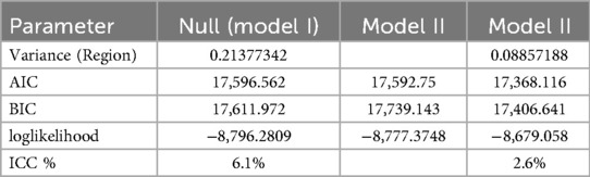 Three models were developed for the multilevel logistic regression analysis to examine the contribution of different levels of factors to early ANC initiation. The first model (Model I), known as the null model, included only the region variable as a random effect to assess the extent of variation in early ANC initiation across clusters, without any explanatory variables. The second model (Model II) included only individual-level factors, excluding regional clustering, to determine their independent effects. The third model (Model III) combined both individual- and community-level factors while accounting for the regional random effect identified in the null model. Developing the models sequentially made it possible to evaluate how the inclusion of additional variables reduced unexplained regional variation and improved model fit. This hierarchical approach is consistent with previous multilevel analyses of maternal healthcare utilization based on Demographic and Health Survey data (20–22).
