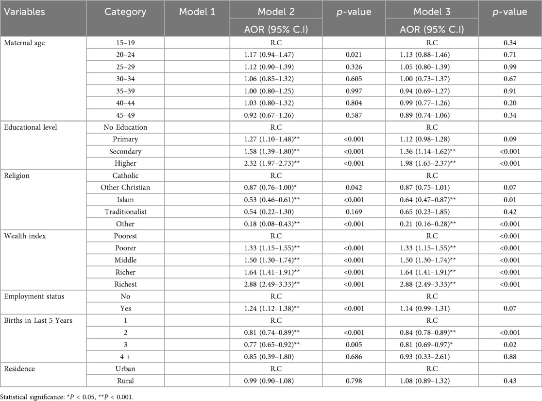 Table 2 summarizes the bivariable analysis of sociodemographic factors associated with first-trimester ANC visits. The results indicate that women with higher education levels are significantly more likely to initiate ANC during the first trimester, with those having higher education showing an odds ratio (COR) of 2.32 (95% CI: 1.97–2.73) compared to women with no education. Wealthier women also had higher odds of early ANC visits, with the richest group having a COR of 2.88 (95% CI: 2.49–3.33). Employment status also showed a significant association, with employed women having higher odds (COR: 1.24, 95% CI: 1.12–1.38) of initiating early ANC visits. Regional analysis revealed that women in the North West were less likely to initiate early ANC compared to those in the North Central region (OR: 0.31, 95% CI: 0.27–0.36).
