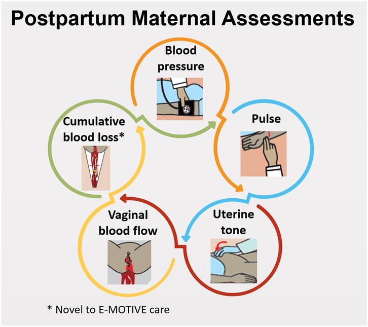 At E-MOTIVE care hospitals, healthcare workers received training to follow specific postpartum maternal assessments and diagnostic criteria for PPH diagnosis. Maternal assessments consisted of assessing uterine tone, vaginal blood flow, and objective cumulative blood loss every 15 min for at least the first hour postpartum, and vital signs [blood pressure (BP) and pulse] at least once in the first hour postpartum.