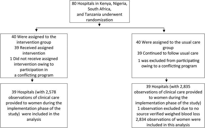 A multi-country cluster-randomised trial (registration number: NCT04341662) assessed the early diagnosis of PPH and a first response treatment bundle at 78 secondary and tertiary level hospitals in Nigeria, Kenya, Tanzania and South Africa (16). This trial had a 7-month baseline phase, then randomisation of the hospitals into either the intervention or control arm. To ensure balance between intervention and control facilities, a minimisation algorithm was used during randomisation—stratified by country—to account for factors such as birth volume, primary outcome rates, oxytocin quality, and the number of clusters per country. This was followed by a 2-month transition phase during which the hospitals allocated to the intervention attended training and embedded the intervention, and finally a 7-month post-randomisation phase, during which phase comparative effectiveness data were gathered.