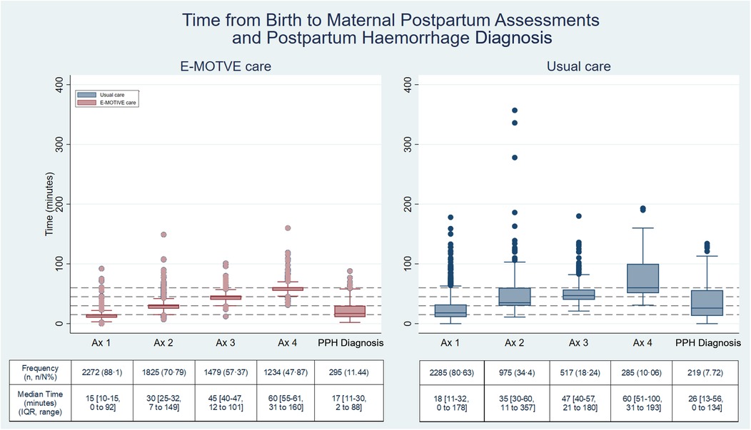 Figure 3. Time from birth to postpartum maternal assessments and postpartum haemorrhage diagnosis. E-MOTIVE care N = 2,578; Usual care N = 2,834; Ax = postpartum maternal assessment; PPH, postpartum haemorrhage; Percentage(%) =number(n)/total number(N); IQR, interquartile range.