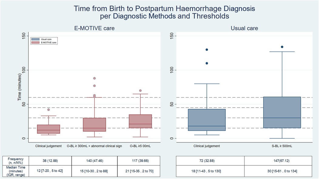 Figure 4. Time to postpartum haemorrhage per diagnosis method and threshold. Clinically diagnosed postpartum haemorrhages: E-MOTIVE care = 295, Usual care = 219; S-BL, subjective blood loss; O-BL, objective blood loss; Percentage(%) =number(n)/total number(N); IQR, interquartile range.