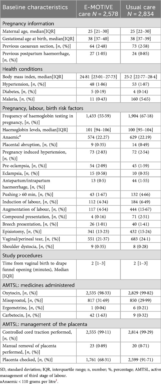 Baseline characteristics of the enrolled women were largely similar across the E-MOTIVE and usual care hospitals, with some notable differences (Table 1). All baseline characteristics are listed in Supplementary Appendix 1, Table 3. Haemoglobin was tested less often at E-MOTIVE care hospitals (56%, 1,433/2,578), compared with usual care hospitals (67%, 1,904/2,834). Augmentation of labour was less frequent at E-MOTIVE care hospitals (5%, 117/2,578) compared with usual care hospitals (16%, 444/2,834). Placental checks as part of active management of third stage were also less frequent at E-MOTIVE care hospitals (68%, 1,761/2,578) than at usual care hospitals (92%, 2,599/2,834).