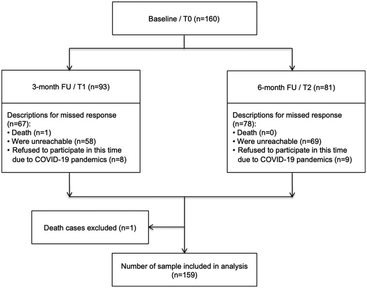 Of the 160 patients who completed the questionnaire at the baseline assessment, one patient died between T0 and T1 and was excluded from the analysis (Figure 1). Moreover, 93 (58.5%) and 81 (50.9%) respondents were willing to fill out the questionnaires (respondent retention) at T1 and T2, respectively. The common reasons for non-response at both follow-ups were being unreachable, with 36% at T1 and 43% at T2, and issues related to the COVID-19 pandemic, with 5% at T1 and 6% at T2 (Figure 1). The mean age of the patients was 50 ± 8.3 years at baseline. The majority of the patients lived in urban areas (72.3%), had a high school education (71.7%), were married (81.8%), and had a good mean KPS score (>65 points) (Table 1).