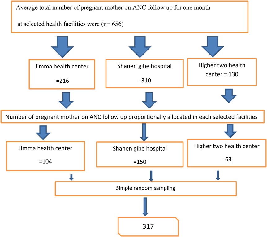 Initially, three health facilities—Shanen Gibe Hospital, Jimma Health Center, and Higher Two Health Center—were selected from a total of six public health facilities in Jimma Town using a simple random sampling technique through the lottery method. Subsequently, the average number of women who attended ANC follow—up sessions at each selected health facility in Jimma Town over the past three months was recorded. Based on this information, the required sample size was proportionally distributed among the selected facilities, taking into account the average number of women participating in ANC follow—up at each site. Participants were chosen using the simple random sampling technique. Finally, eligible individuals from the public health facilities were recruited for the study (Figure 1).