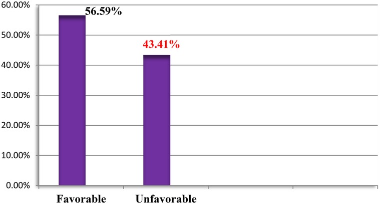 The study findings suggested that more than half (56.59%) of the participants had favorable attitudes, while 43.41% of the respondents had unfavorable attitudes (Figure 4).