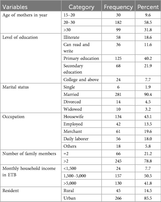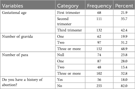 Out of a total sample size of 317, 311 pregnant women were included in the present study, resulting in a response rate of 98.1%. The findings revealed that over half (58.5%) of the participants fell between the ages of 20 and 30 years. In terms of educational attainment, only 7.7% of the participants had completed college-level education or higher. The majority of participants (90.4%) were married, and nearly half (43.1%) identified as housewives. In addition, a significant proportion of participants (78.8%) reported having more than two family members, and 85.5% were residents of urban areas (Table 1).