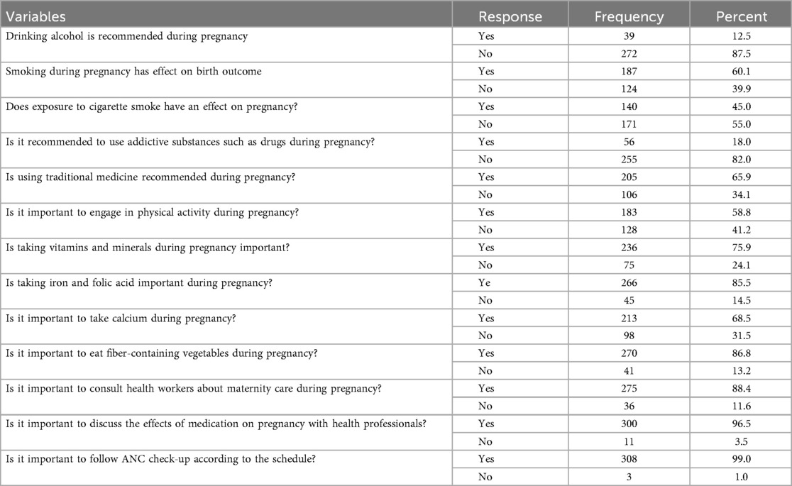 The majority (87.5% and 60.1%, respectively) of the respondents correctly noted that drinking alcohol is not recommended during pregnancy and smoking during pregnancy has a harmful effect on birth outcomes. The findings suggest that 58.8% of the respondents noted the importance of physical activity during pregnancy, 75.9% understood the importance of taking vitamins and minerals, and 68.5% recognized the importance of calcium intake during pregnancy (Table 3).