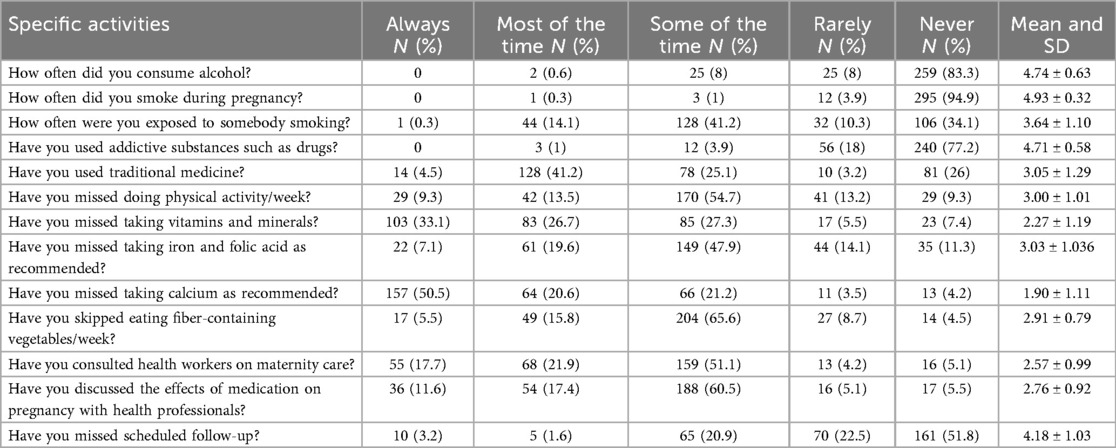A significant majority of the participants (83.3%) reported refraining from alcohol consumption during their pregnancy. Almost all respondents (94.9%) stated that they did not smoke, although 14.1% were frequently exposed to secondhand smoke. The frequent use of traditional medicine during pregnancy was reported by 41.2% of the participants, with an additional 25.1% using it occasionally. Only 9.3% of the study population engaged in regular physical activity, and 7.5% consistently consumed vitamins and minerals. Furthermore, a mere 11.3% adhered to the recommended intake of iron and folic acid. In addition, only 17.7% of respondents sought guidance from healthcare professionals regarding maternity care, while 11.6% discussed the implications of medication use during pregnancy with health experts. Notably, approximately half of the participants (51.8%) reported that they never missed their scheduled follow-up appointments (Table 4).
