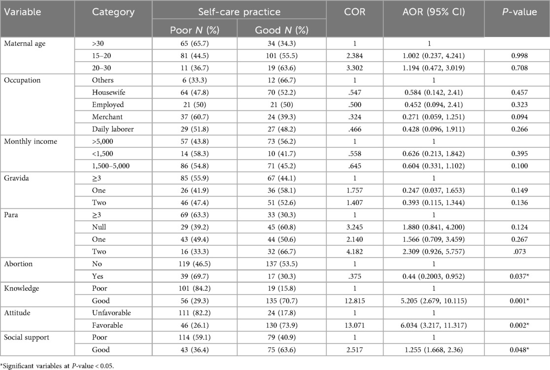 Those with a favorable attitude were six times more likely to follow good self-care practices (AOR: 6.034, 95% CI = 3.217–11.317, P = 0.002) than those with an unfavorable attitude. Women with good social support were 1.255 times more likely to follow good self-care practices (AOR: 1.255, 95% CI = 1.668–2.36, P = 0.048), compared with those with poor social support (Table 5).