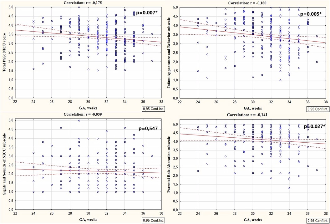 Figure 1. Correlations between total PSS: NICU scores, sights and sounds of NICU subscale, infant appearance and behavior subscale, and parental role alteration subscales scores with the GA.
