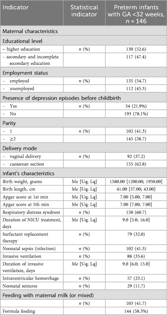 There were 146 mothers of infants with GA <32 weeks (extremely and very preterm infants) and 101 mothers of infants with GA > 32 weeks (moderately and late preterm infants). The average GA of infants was 32.0 [30.0; 33.0] weeks. There were 143 (57.9%) boys and 66 (42.1%) girls. Anthropometric indicators (birth weight, birth length), Apgar score and clinical characteristics of infants are presented in Table 1.