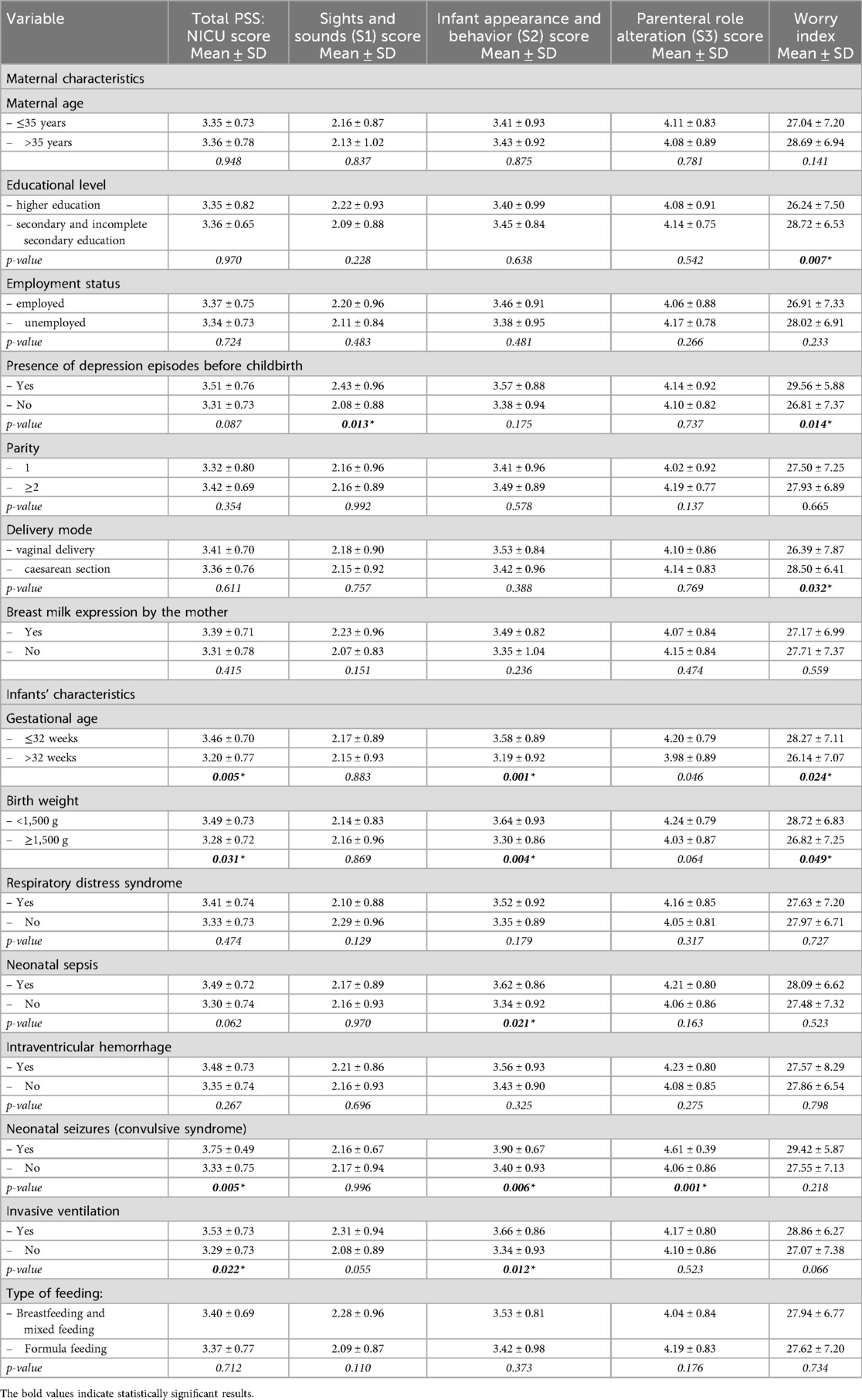 Not only gestational age but also other factors may influence the intensity of maternal stress in NICU settings. According to our second hypothesis, this study also aimed to identify additional maternal factors and infant clinical characteristics that exacerbate stress and negative experiences in mothers following preterm birth.