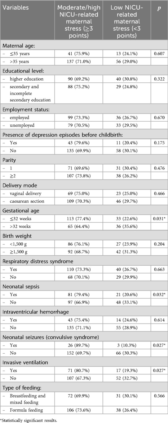 Table 3. Factors associated with moderate/high levels of NICU-related maternal stress, identified by univariate analysis.