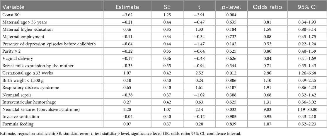 Logistic regression analysis identified statistically significant factors associated with the NICU-related maternal stress (Table 4). Gestational age and the presence of seizure syndrome in infant had a significant impact. Specifically, gestational age under 32 weeks was independently associated with a 2.9-fold increased risk of moderate/high maternal stress (OR = 2.90; 95% CI: 1.26–6.68; p = 0.012), while the presence of seizure syndrome increased the likelihood of moderate/high stress development nearly 10-fold (OR = 9.83; 95% CI: 1.19–80.80; p = 0.033).