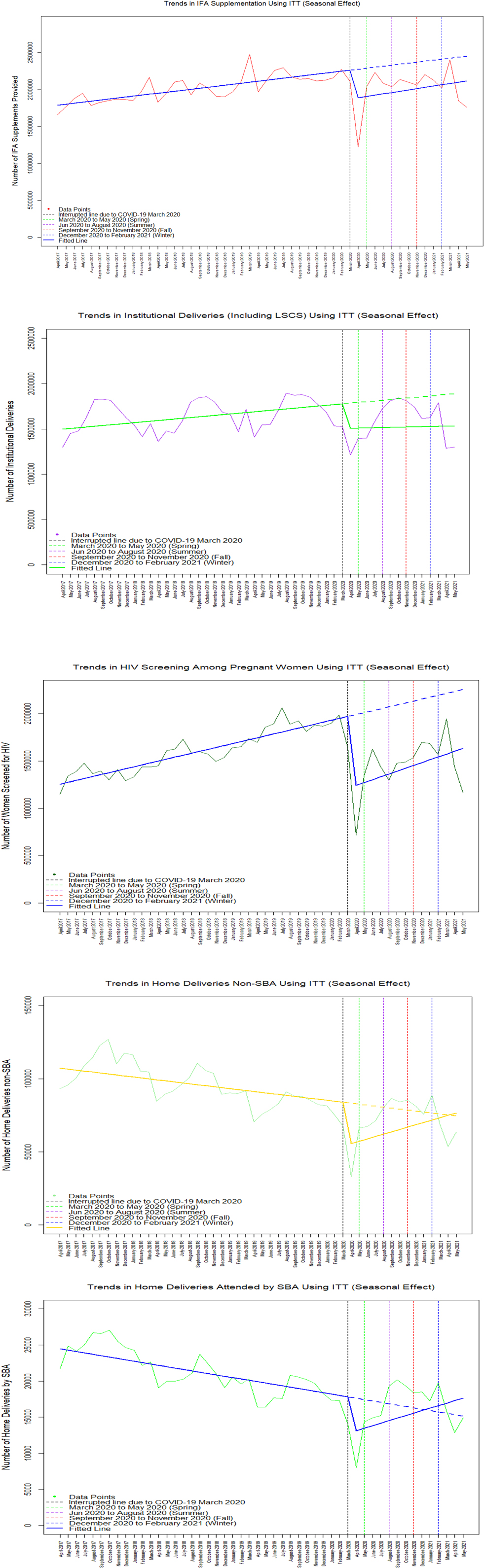 Figure 2. Graphical representation of interpreted time series modeling showing seasonal variation in MCH indicators during the COVID-19 pandemic, India.
