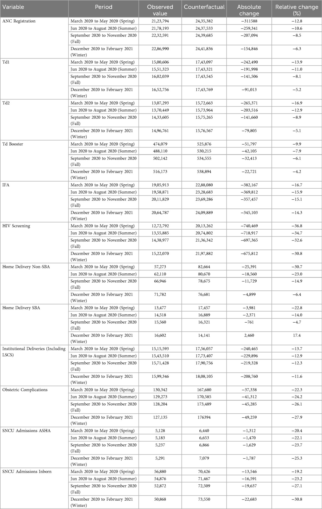 The analysis of maternal and child health (MCH) services during the COVID-19 pandemic reveals substantial disruptions in service utilization across all major indicators, with notable seasonal variations. These findings are derived from interrupted time-series modelling that compared observed values during the pandemic to counterfactual estimates based on pre-pandemic trends.
