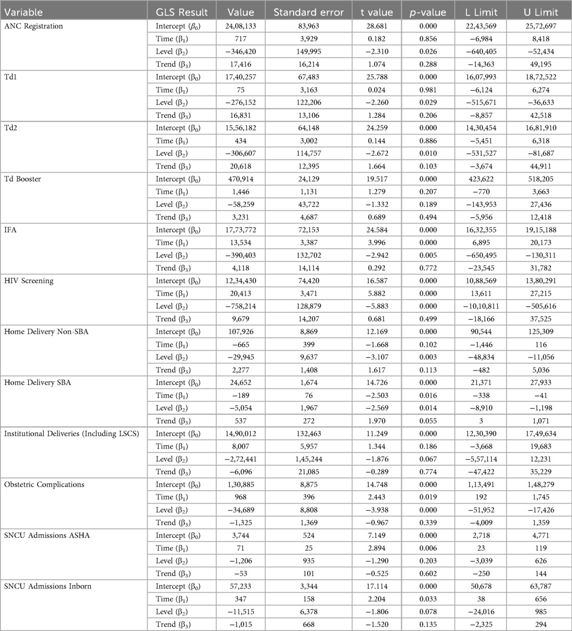 Methods: A retrospective analysis using Health Management Information System (HMIS) data examined 12 indicators of service utilization, covering maternal health, child health, deliveries, and newborn care. Interrupted time-series analysis compared pre-pandemic (April 2017–March 2020) and pandemic (March 2020–May 2021) was performed using Ordinary Least Squares (OLS) and Generalized Least Squares (GLS) regression models, adjusting for seasonality and autocorrelation with ARMA terms.