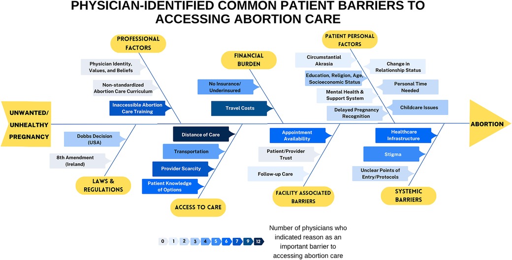 Figure 2. Fishbone diagram and heat map highlighting barriers to abortion care. The darker the blue color, the more often that barrier was mentioned during interviews.