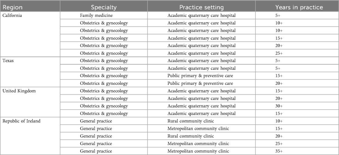 A total of 19 abortion-trained physicians were recruited using purposive and snowball sampling, which was particularly useful given the limited number of physicians who publicly identify as providers of abortion care. Participants were drawn from CA (n = 6), TX (n = 4), the UK (n = 4), and the ROI (n = 5) (Table 1). Inclusion criteria included active or recent clinical experience in abortion care and English language fluency. We limited our study to physicians (MD, DO, MBBS, or equivalent) to focus our discussion on this group's training and scope of practice. Recruitment continued until thematic saturation was reached, meaning no new themes emerged in the final interviews.