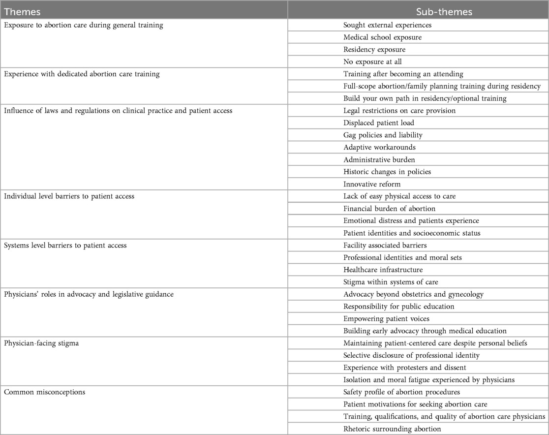 Discussion: These findings highlight that policy functions as a major determinant of health and that centering on patient experiences, standardizing education, addressing healthcare infrastructure barriers, strengthening peer support systems, continued physician advocacy, and systemic reforms are necessary to reduce preventable delays, patient distress, and disparities in care. This study highlights the importance of incorporating physicians' perspectives into legislative discussions to ensure accurate representation of patient needs and challenges in accessing abortion care.