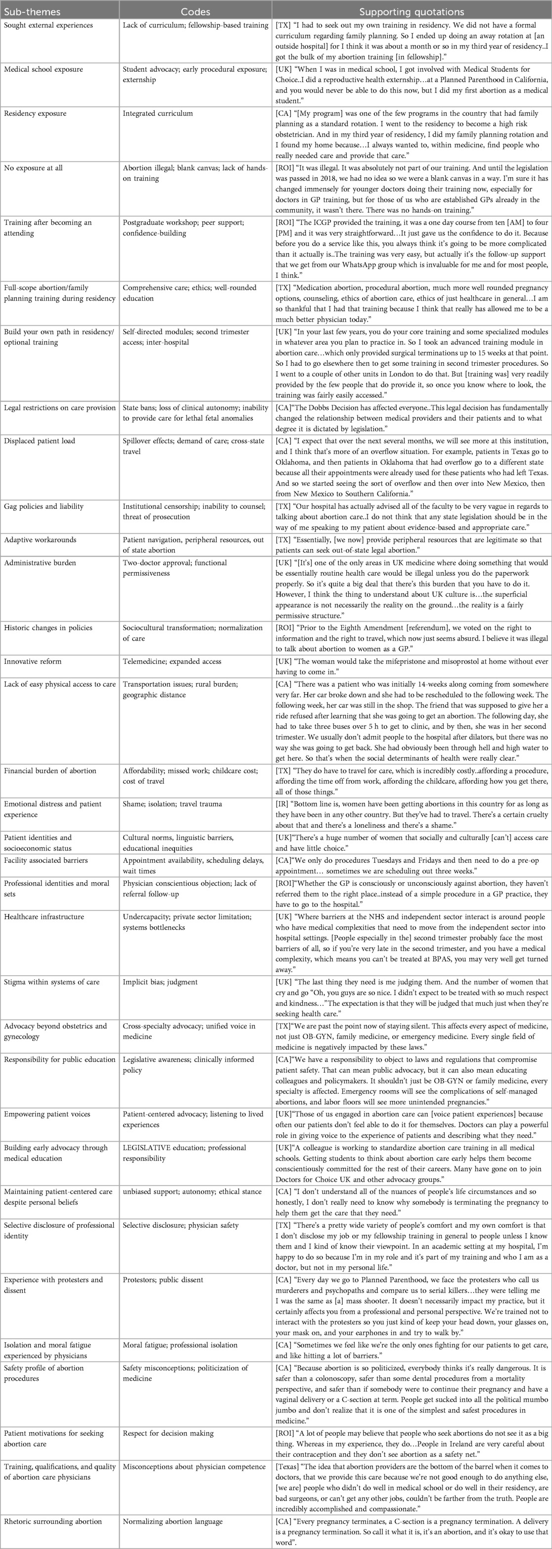Results: Analysis revealed several interconnected themes. Across all geographical practices, physicians highlighted the importance of centering care on patients' needs, but variations in legislation largely shaped clinical care. Training experience varied widely with many shaping their own education in the context of available resources. Changing policies functioned as a clinical variable, often shifting with cultural and political attitudes. Geographic, financial, facility-related, and healthcare infrastructure barriers compounded legislative obstacles, highlighting that legality does not guarantee accessibility. Participants additionally emphasized cross-specialty advocacy, reported experiences with stigma, and dispelled common misconceptions on abortion.