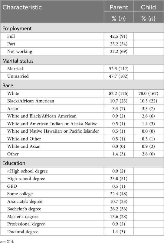 The majority of the caregivers (72.0%) identified as female and their average age was 33.5 years. Target children of caregivers who participated in the study were 58.0% male (n = 124) and the average age was 3.9 years. Parents in the study experienced on average 3 traditional ACEs and 5.3 expanded ACEs. The most commonly reported ACEs endorsed were emotional abuse (53.3%), living with a caregiver who was mentally ill (43.9%), physical abuse (40.8%), and parental separation (40.8%). Thirty-nine percent of the sample (n = 84) reported experiencing four or more traditional ACEs. In terms of socioeconomic status, parents' average self-rated SES was 4.42 (out of 10) at the time of the study. See Table 1 for a full breakdown of demographic characteristics of the sample.