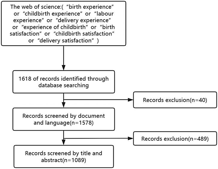 We conducted a systematic literature retrieval from the Web of Science Core Collection (WoSCC), the premier multidisciplinary citation database containing over 21,000 high-impact journals across 254 disciplines. The search strategy employed Boolean operators: TS = (“birth experience” OR “childbirth experience” OR “labour experience” OR “delivery experience” OR “experience of childbirth” OR “birth satisfaction” OR “childbirth satisfaction” OR “delivery satisfaction”).