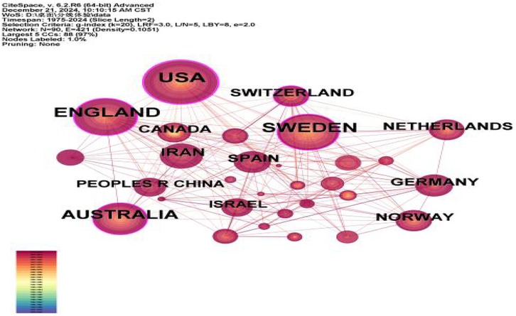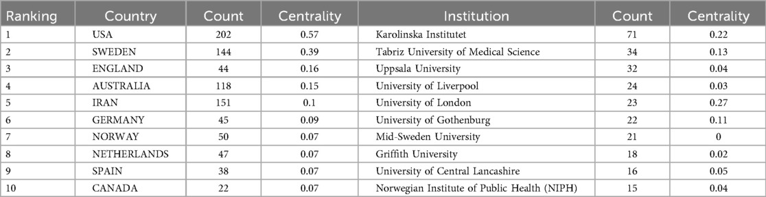 According to the analysis of Table 1 and Figure 3, it can be seen that a total of 90 countries have published literature related to childbirth experience, of which the United States, Sweden, the United Kingdom, and Australia are the core output forces, accounting for 56.11% of the total output, and the top 10 countries with the highest number of issuance account for 84.31% of the total number of issuance; the United States and Sweden are more centrally oriented and have a greater influence. In the co-authorship network, the United States and Sweden exhibit high centrality, indicating their roles as major hubs for international collaboration and their significant influence within the global research landscape of maternal childbirth experience.