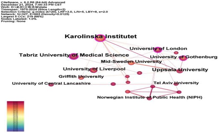 According to the analysis of Table 1 and Figure 4, it can be seen that a total of 327 institutions have published literature related to childbirth experience, and the institution with the most publications is Karolinska Institutet in Sweden, which has published 71 articles, and the institution with the strongest centrality is the University of London in the UK, which has published 23 articles and has the most prominent academic influence. As far as the inter-institutional cooperation relationship is concerned, there are 665 connections of 327 nodes, with a network density of 0.0125, indicating that the cooperation and exchange between institutions is not sufficient and needs to be deepened.
