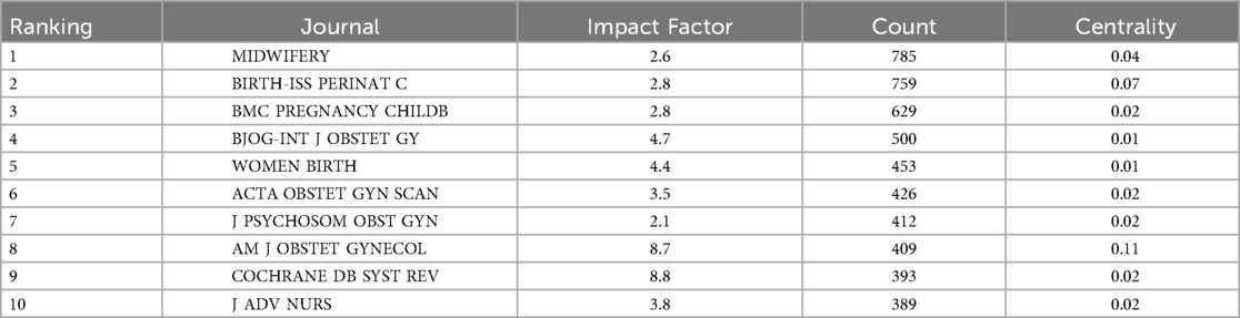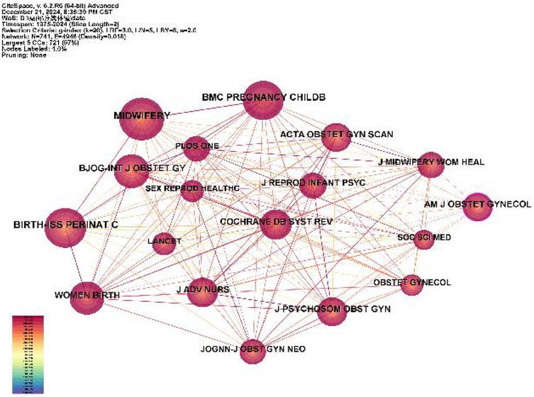 According to the analysis in Table 2 and Figure 5, there are 741 journals published in the literature related to childbirth experience, most of which are in Europe and America. The most cited journals are MIDWIFERY (impact factor of 2.6) with 785 citations, followed by BIRTH-ISS PERINAT C (impact factor of 2.8) with 759 citations. Among them, AM J OBSTET GYNECOL (with an impact factor of 8.7) has the strongest centrality and the greatest academic impact. As far as the collaboration between journals is concerned, there are 4,946 links of 741 nodes with a node density of 0.018, which indicates that there is less collaboration between journals.