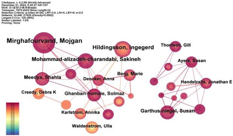 As shown in Table 4 and Figure 6, a total of 446 authors have published literature in the field of childbirth experience. The most prolific author is Mojgan Mirghafourvand, from Ireland, with 31 publications. The co-authorship network, comprising 446 nodes and 620 links, has a density of 0.0062, indicating a generally sparse collaborative structure. Analysis reveals a primary collaborative cluster centered around Mojgan Mirghafourvand, who maintains strong ties with co-authors such as Sakineh Mohammad-alizadeh-Charandabi and Shahla Meedya. A secondary cluster is formed around Solmaz Ghanbari-Homayi and other core authors. However, collaborative activities beyond these core groups remain limited. The future promotion of wider-ranging collaboration is crucial for integrating diverse expertise and tackling the complex, multifaceted nature of research on childbirth experiences.
