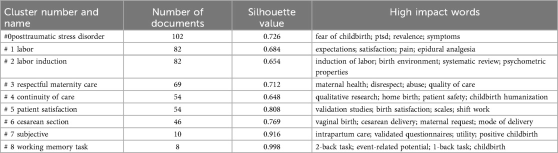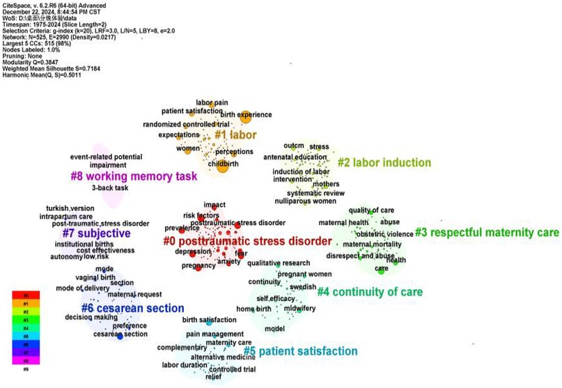 Keyword clustering is a method of grouping multiple similar keywords into a single label using induction, which reflects the research hotspots in the research process and helps to identify future research directions in the field. According to the analysis in Table 6 and Figure 7, a total of nine clusters were generated for keywords related to childbirth experience, and the clustering results showed that the Q value was 0.3847 and the S value was 0.7184, which made the clusters plausible. The clustering keywords were mainly “posttraumatic stress disorder” “labour” “labour induction” “respectful maternity care” “continuity of care” “patient satisfaction” “cesarean section” “subjective” and “working memory task”. The areas covered include factors influencing the maternal birth experience, assessment tools, quality of care, and research methods.