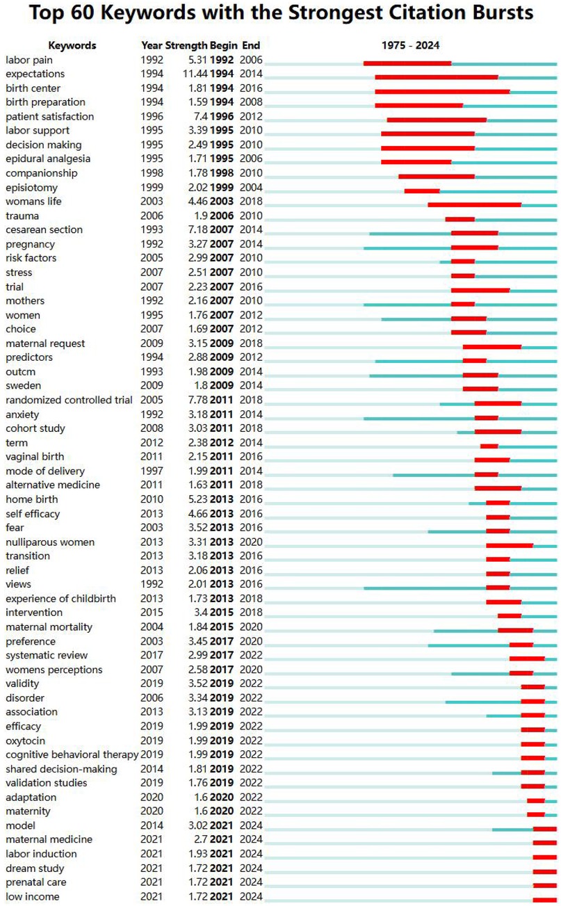The keyword “model” in the emergence chart has emerged more frequently in recent years. This may be due to the increasing attention paid by society to women's health and reproductive rights, as well as the rising expectations of mothers for the birth experience, which have led to innovations in birth models. Examples include home-based birthing centers and personalized birthing plans, which emphasize the autonomy and comfort of the mother. Studies (32, 33) have shown that this model allows women to better express their needs and preferences, reduces unnecessary medical interventions, lowers cesarean section rates, and improves the overall birth experience. However, research in this area still needs to be deepened, especially in terms of cultural adaptation, long-term effects, and policy translation. Future research should focus more on multidisciplinary collaboration and global perspectives to provide more comprehensive and personalized support for women's birth experiences.