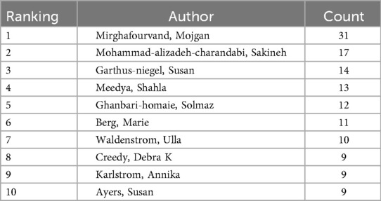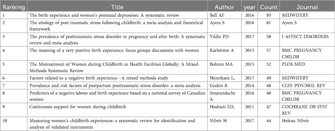 From the analysis of Table 3, it can be seen that the most cited literature is “The birth experience and women's postnatal depression: A systematic review” (93 citations), which systematically evaluates the relationship between labor and delivery experience and postnatal depression, and suggests that poor labor and delivery experience can cause maternal postnatal depression. This was followed by “The etiology of post-traumatic stress following childbirth: a meta-analysis and theoretical framework” (cited 81 times) and “The prevalence of posttraumatic stress disorder in pregnancy and after birth: a systematic review and meta-analysis” (cited 58 times), the above two papers analyzed the relationship between post-traumatic stress disorder and childbirth experience, and the analysis concluded that adverse childbirth experience was the greatest predictor of postpartum PTSD.
