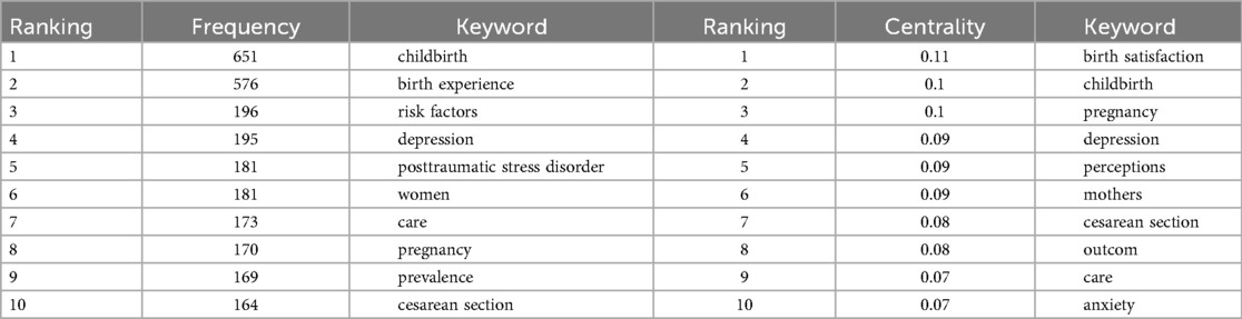 Keywords are a high degree of summary and condensation of the theme of the literature, and by analyzing the high-frequency keywords of the literature, we can reveal the hotspots and tendencies of the research in this field and the relationship between the research themes. After combining the synonyms, the keywords are ranked in the keyword map in Table 5, and the words with the highest frequency are “childbirth”, “birth experience”, 651 and 576 times respectively, followed by the words “risk factors”, “depression”, “posttraumatic stress”, and so on. “risk factors”, “depression”, “posttraumatic stress disorder”; the words with centrality ≥0.1 were “birth satisfaction”, “child birth”, and “pregnancy”, indicating that they are hot topics in the study of birth experience.