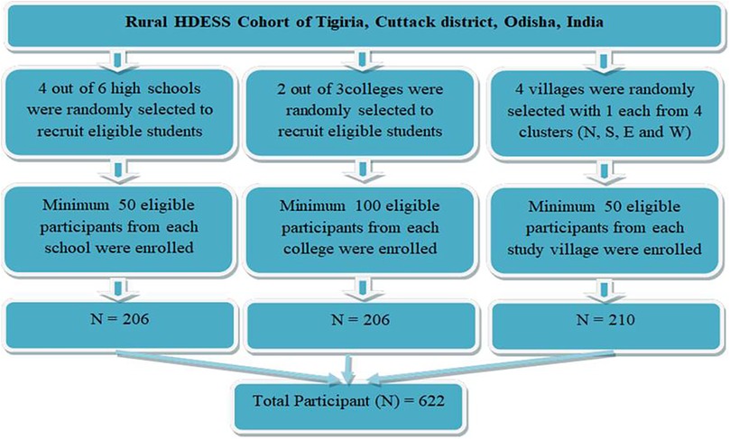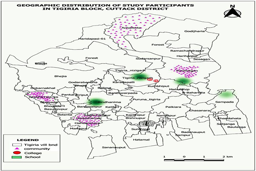 We attempted to recruit 200 participants from each study group for equitable representation across the three cohort. This ensured feasibility while maintaining comparative analysis power across subgroups and avoid overrepresentation of any single group. Four schools and two colleges were randomly selected out of six schools and three colleges, respectively (available in the study setting). Four villages were randomly selected with one each from each of the directional-clusters of North, South, East, and West for better geographical representation. A minimum of 50 community women participants were recruited from each of the selected villages. Survey team visited consecutive households (following HDESS survey method) in the villages until the desired sample size is acheived. In case of non-availability of any eligible participant, the neighbour household was considered. The process followed in recruiting the study participants and their geographic distribution in the HDESS area are presented in Figures 1, 2 respectively.