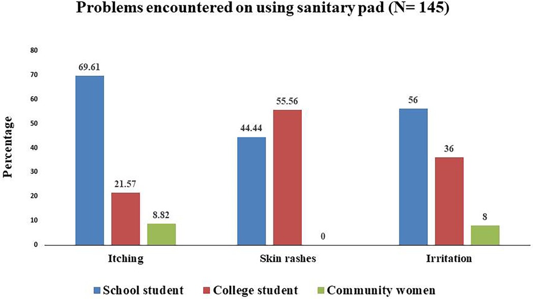 Figure 4 illustrates the distribution of health-related issues associated with the use of sanitary pads among school students, college students, and community women. Among the 149 (23.9%) sanitary pad users who reported pad-associated problems, we only calculated this for 145 participants who could define their problems properly. From them, 93 (64.14%) were school students, 41 (28.2%) were college students, and 11 (7.5%) were community women.