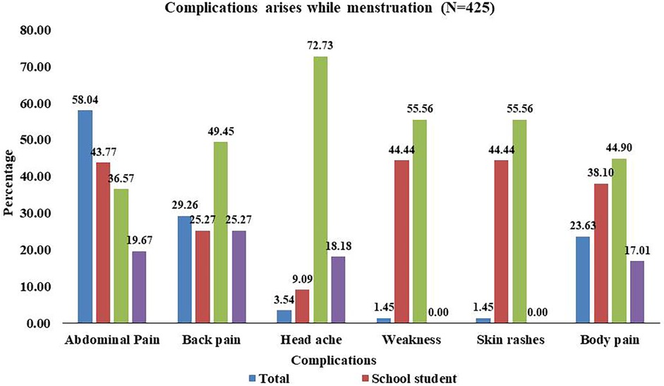 Menstruation-related health problems such as body pain, abdominal pain, skin rashes, heavy bleeding, and headaches were reported by 68.32% of participants (39.1% among school students and 38.6% among college students).