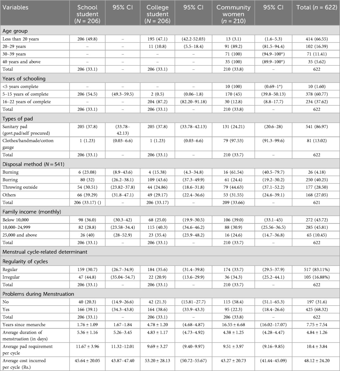 This study included socio-demographic information like age groups (less than 20, 20–29 years, 30–39 years and 40 and above), years of schooling (<5 years complete, 5–15 years of complete, 16–22 years of complete), family income (<Rs.10000, Rs.10000–24999, >Rs. 25000), types of pad use (sanitary pads including government and self procured pad and clothes including handmade, cotton and gauges), disposal methods (throwing outside, burning and burying). Additionally, it included menstrual history like regularity of cycles (We defined an irregular menstrual cycle if the gap between two cycles were shorter than 22 days or more than 41 days) (12), problems during menstruation(self reported), years since menarche and average duration of menstruation, average pad requirement per cycle and average cost incurred per cycle. In problem during menstruation, problems like abdominal pain, back pain, head ache, Hand and leg pain, weakness, nausea, vomiting are repotrd and are completely self reported. Among problems related to sanitary pad use included Itching, skin rashes, and ittitation and is also self reported.