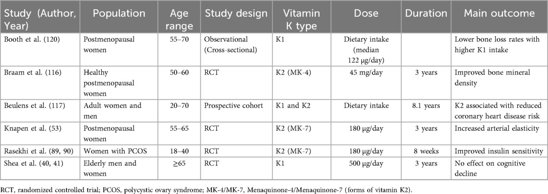 “Several randomized controlled trials (RCTs) demonstrated positive effects of vitamin K2 supplementation, particularly MK-4 and MK-7, on bone mineral density (116) and arterial elasticity (53).