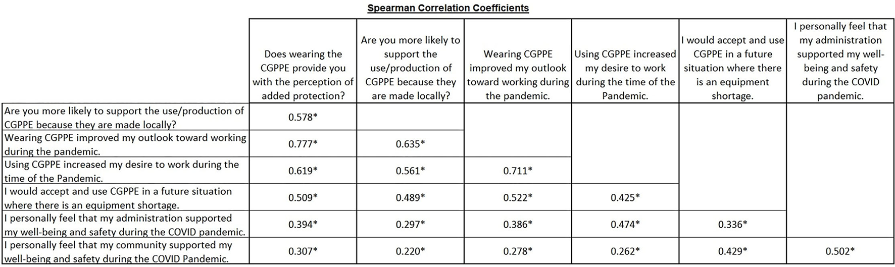 To determine whether there were any associations between factors pertaining to the participants use and outlook regarding the manufactured PPE and their perception of well-being and safety, Liker scale responses were assessed via Spearman Correlations. This study demonstrated strong correlations between several separate factors (Figure 1). The strongest correlation was between respondents who positively ranked that wearing CGPPE improved their outlook toward working during the pandemic and those who positively ranked that wearing PPE provided them with the perception of added protection (r = +0.777). These HCWs may have experienced improved outlooks as a result of the extra protection they believed was occurring with a greater PPE availability provided by CGPPE. This could open into discussion on how perceived safety may create an emotional benefit that improves HCW outlooks during times of great stress. Furthermore, the respondents who indicated an improved outlook toward working also strongly correlated with being more likely to support CGPPE use and production because it was made locally (r = +0.635). Perhaps these individuals regarded local CGPPE donations as a form of appreciative support from their community for the work they were undertaking.