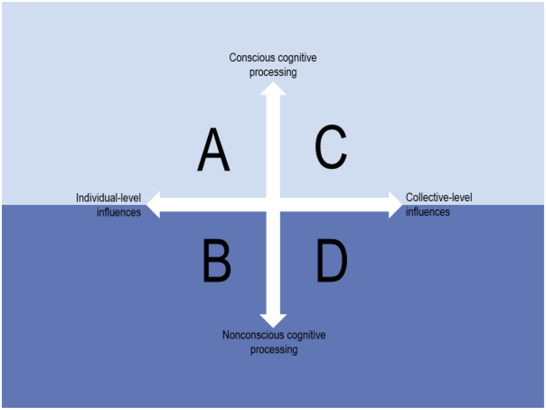 The distinction between collective-level conscious and non-conscious processing, i.e., squares C and D, appears to be absent in studies in implementation science. Of course, collective-level influences such as a professional or organisational culture can be difficult to study because they partially depend on non-conscious cognitive processes, and are thus largely “invisible” and difficult to grasp. Schein (43) argues that members of a specific culture may need outside help to be able to make the shared tacit assumptions that make up the culture explicit. Similar challenges likely exist with regard to studying abstract collective-level concepts, such as institutional logics and routines, to explain their influence on individual's behaviours. Again, observational methods may be relevant to study collective-level influences and behaviours guided primarily by non-conscious cognitive processes. Such methods enable researchers to observe what people actually do (and not merely what they say they do) (71), which allows for exploration of group and other collective dynamics as well as studies of behaviours that are more unreflective and automatic.