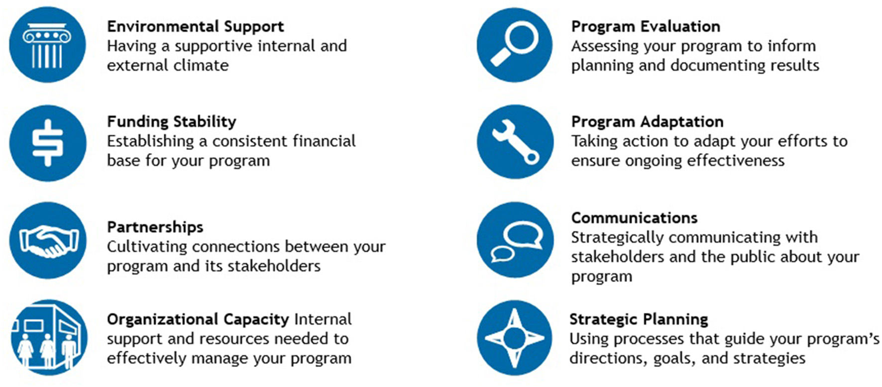 This eight-domain conceptual framework is useful to help programs and organizations looking to understand the factors beyond simple funding that affect a program's capacity for sustainability. For example, programs that collect evaluation data about their processes and outcomes can better demonstrate the necessity of their program to leadership and stakeholders (13). Communicating concise outcome data to policymakers and showing a program's impact on the community better positions the program for continued funding and support (14).