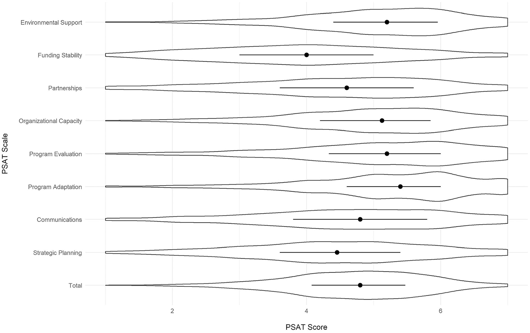 All of the scores for the PSAT were out of a possible total of 7, with 7 being the greatest extent of each domain. Across all programs, the mean PSAT score was 4.73 (Table 2). PSAT subscale scores were lowest for funding stability (M = 3.97), followed by strategic planning (M = 4.42), partnerships (M = 4.47), communications (M = 4.64), organizational capacity (M = 4.98), program evaluation (M = 5.08), environmental support (M = 5.08) and program adaptation had the highest average score (M = 5.23). Although the subscale and total mean scores are somewhat high relative to the seven-point scale, score variabilities are relatively high (standard deviations ranging from 1.13 to 1.43), indicating only minor issues with restriction of range. Figure 2 presents violin plots of the total and subscale scores, displaying the median values for each, as well as the score variabilities.