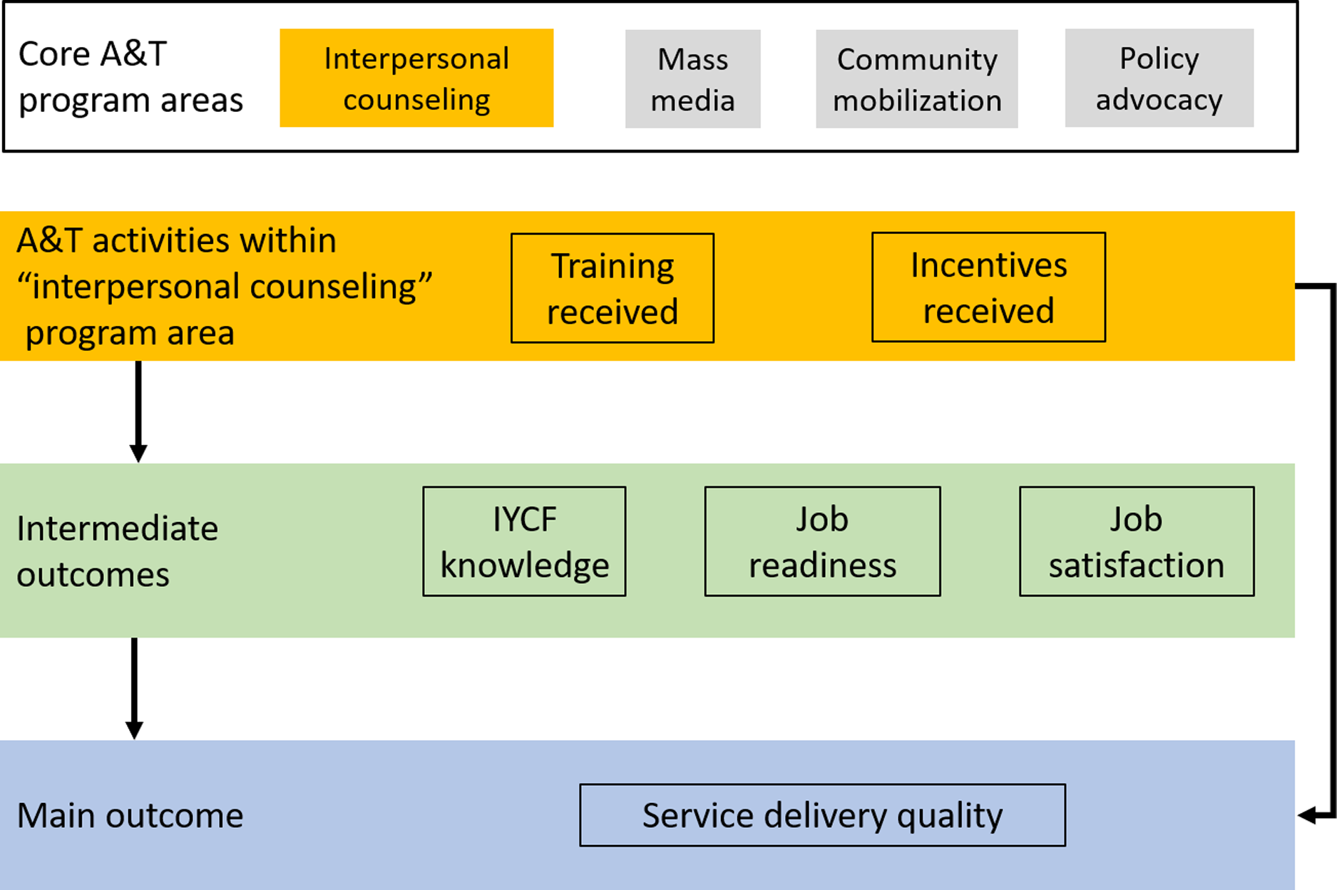 Figure 1. Conceptual framework of the hypothesized relationship between Alive & Thrive Phase 1 program areas and activities, and outcomes among health workers (intermediate and main outcomes).