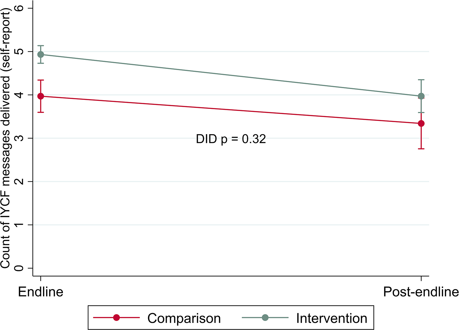 The program effect was not sustained for quality of IYCF service delivery, i.e., number of IYCF topics discussed during care. As shown in Table 3 (comparing the outcome at each time point for intervention vs. control) and Figure 2 (demonstrating the differences in the changes in the outcome over time), the adjusted marginal predictions of self-reported number of IYCF topics discussed during IYCF counseling visits was significantly higher among health workers in intervention areas than comparison areas at endline (4.93 [SE 0.10] topics covered by health workers in intervention areas and 3.97 [SE 0.18] topics covered by health workers in comparison areas). By post-endline, delivery of IYCF messages declined among both intervention and comparison health workers, with no significant difference in this decline (DID p = 0.32). The difference between intervention and comparison areas was marginally significant at post-endline (3.97 [SE 0.18] topics covered by health workers in intervention areas and 3.34 [SE 0.28] topics covered by health workers in comparison areas).
