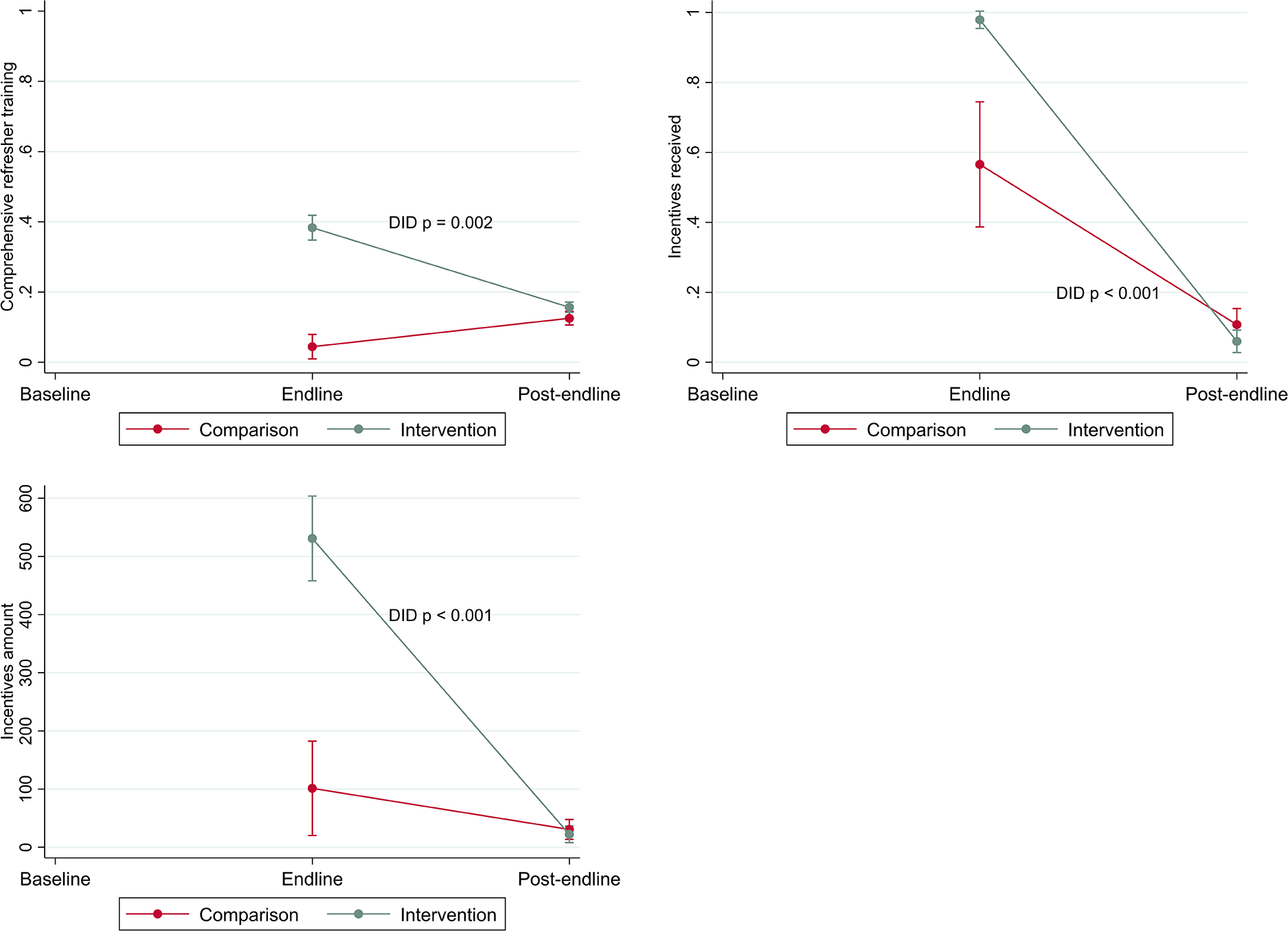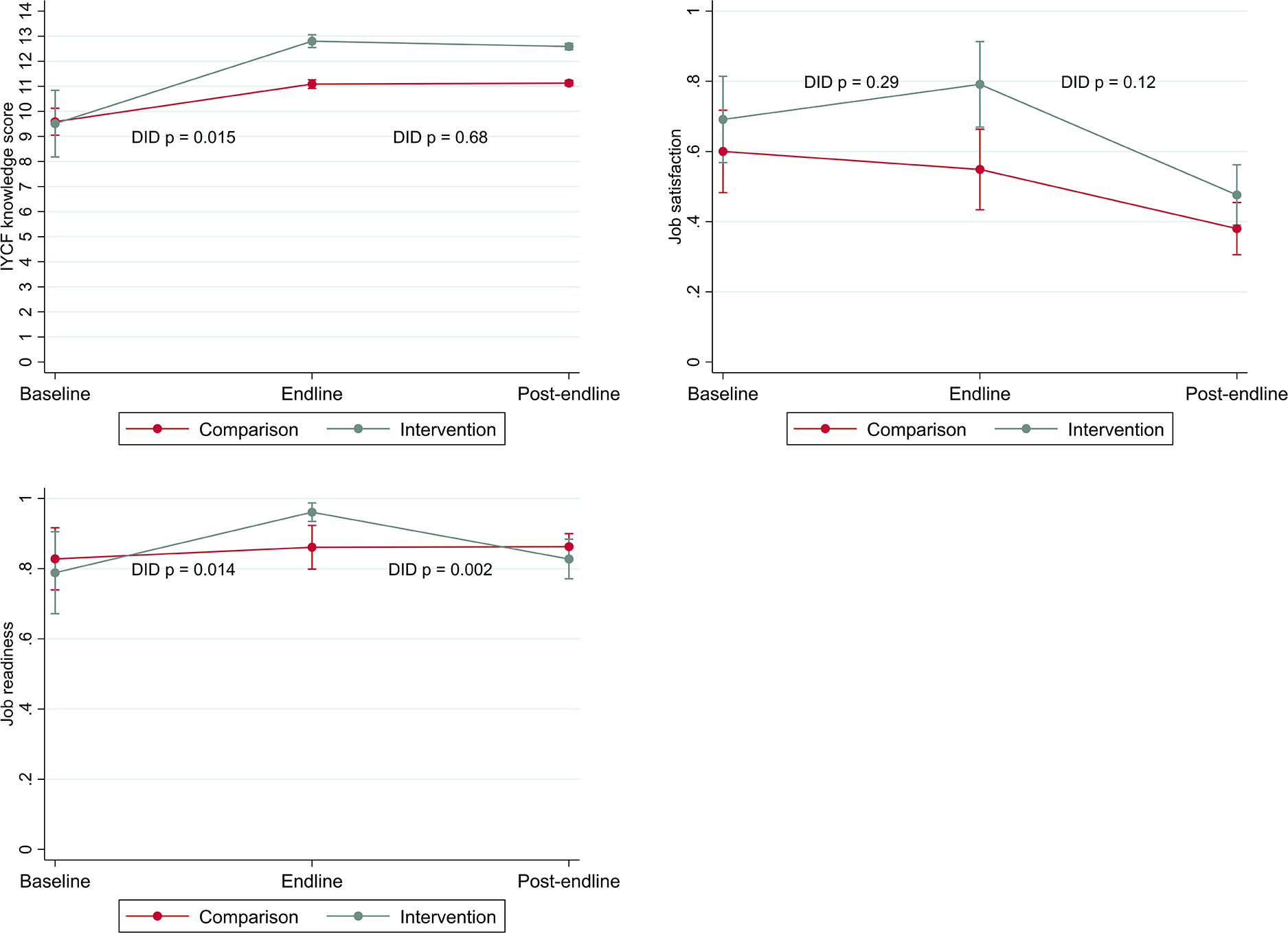 In intervention areas, health workers experienced an increase in reported job readiness by endline, while there was no change among workers in comparison areas (DID p = 0.014). However, by post-endline intervention-area workers had returned to their baseline level, while health workers in comparison areas reported no change (DID p = 0.002).