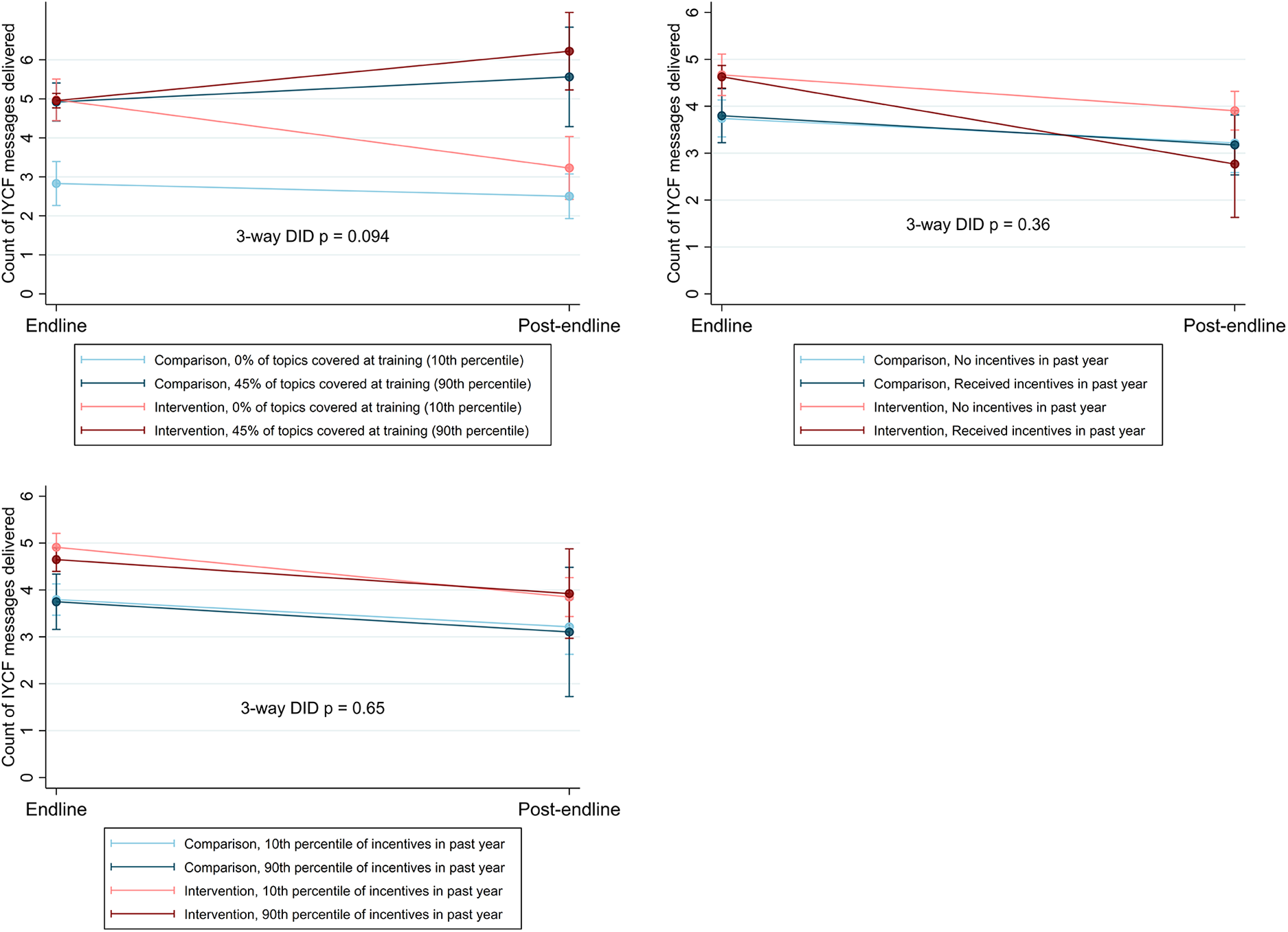 There was no apparent effect of incentives, whether presence of any incentive or the amount of incentive, on quality of IYCF service delivery nor on intermediate outcomes (Figure 5 and Supplementary Appendix Figures S1–S3), with the exception of job readiness—health workers in intervention areas with no incentive reported lower job readiness at endline, but converged with their peers at post-endline.