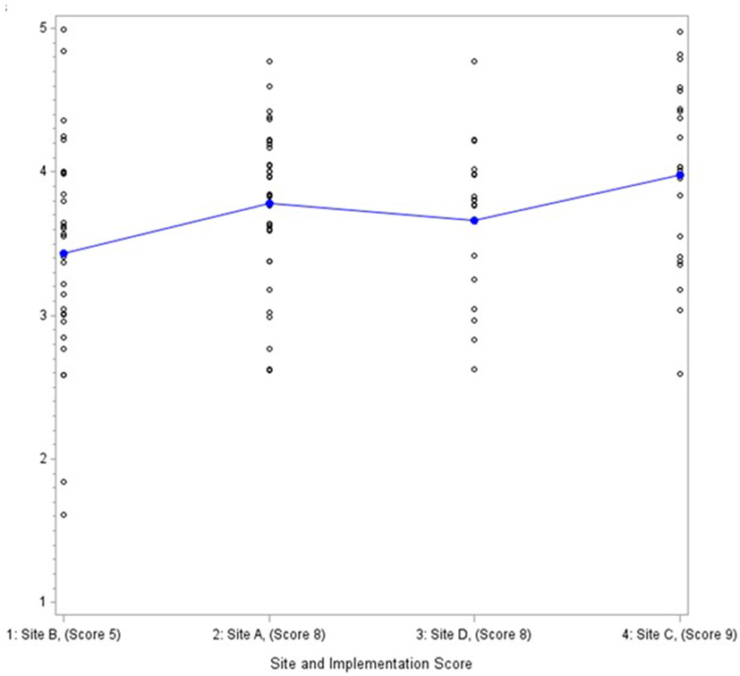 Data from the provider survey were analyzed descriptively with means, standard deviations and differences across sites calculated for each CFIR construct using the Statistical Analysis System (SAS) 9.4. Scales were formed by summing relevant items and then dividing by the number of items to create a scale score. Cronbach alphas were calculated on scales with three or more items to assess inter-item reliability. We examined differences in CFIR constructs across the four EDs using a ANOVA and Wilcoxon rank sum test. Given we were interested in organizational-level variables and the study had just four EDs, we then used graphical displays with sites ordered by fidelity score (Figure 1) to identify patterns associated with implementation fidelity descriptively. Consistent with a convergent mixed methods design, findings were then compared and contrasted across methods.